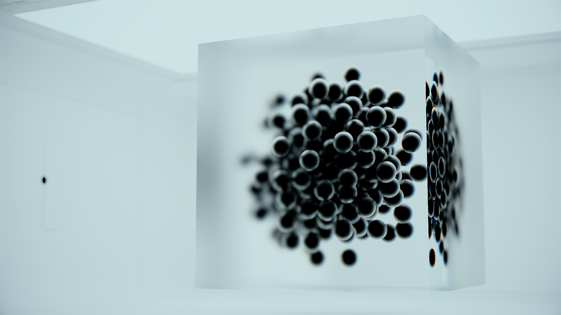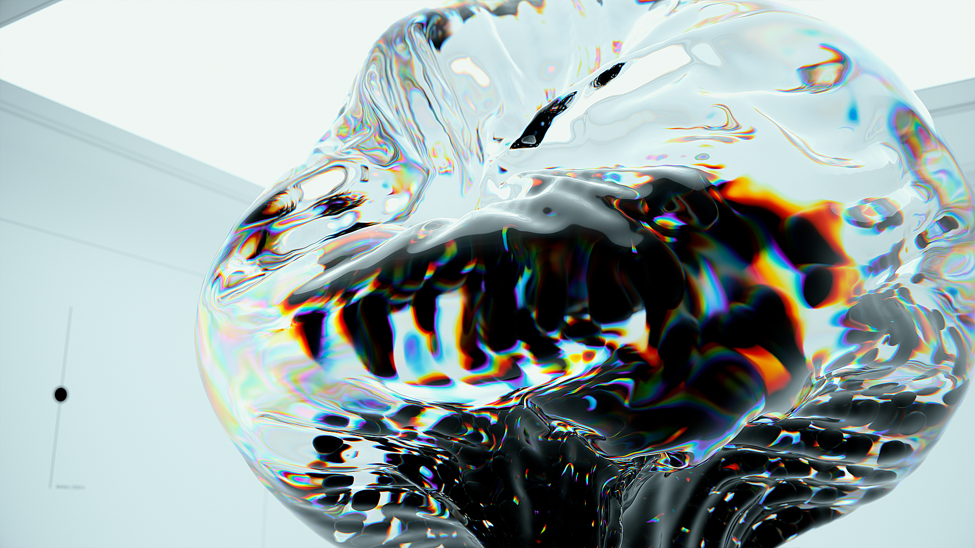 Blending architectural gallery space with computer-generated digital glass sculptures, they encounter animated refractions, chromatic aberrations, colourful reflection and other conditions which are impossible in reality.